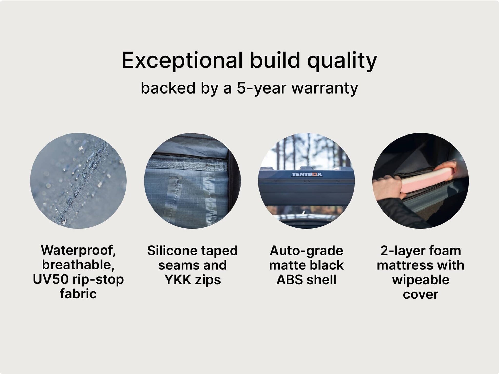 High-end outdoor fabrics have been used throughout. It's fully waterproof, breathable and UV resistant. All zips are YKK and all seams are sealed with silicon tape. All doors have a fine fly mesh layer. The roof is lined with a luxury mesh fabric.